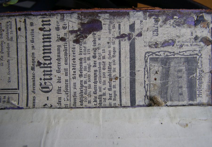 Da ist die Rückeneinlage,sie ist viel jünger als der erste Einband.Der damalige Restaurator hat eine aktuelle Zeitung von 19 ...hundert genommen.